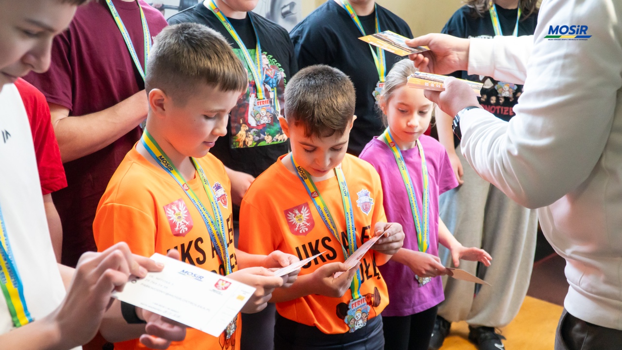 Na zakończenie ostatnich zajęć organizowanych w ramach "Ferii na sportowo 2026" przygotowano niespodziankę dla młodych atletów. Wszyscy otrzymali pamiątkowe medale oraz nagrody rzeczowe ufundowane przez prezydenta Ostrołęki Pawła Niewiadomskiego.