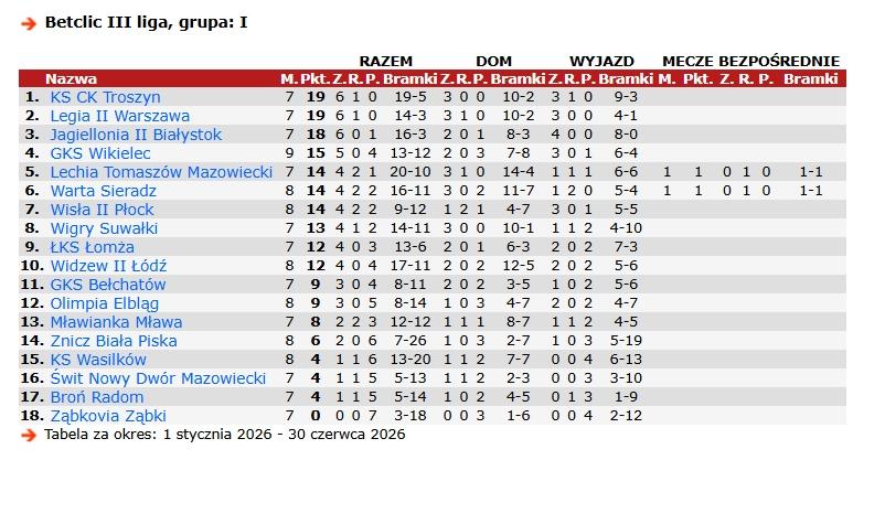 W tabeli rundy wiosennej III ligi, grupy I, KS CK Troszyn zajmuje obecnie pierwsze miejsce z 19 punktami. Druga Legia II również ma 19 "oczek". Tuż za nimi plasuje się Jagiellonia II Białystok (18 pkt) oraz GKS Wikielec (15 pkt). Należy jednak podkreślić, że Troszyn rozegrał 7 spotkań, podczas gdy niektóre drużyny mają na koncie o mecz, albo i dwa, więcej. Spójrzmy tylkona tabelę wiosny, za 90minut.pl: